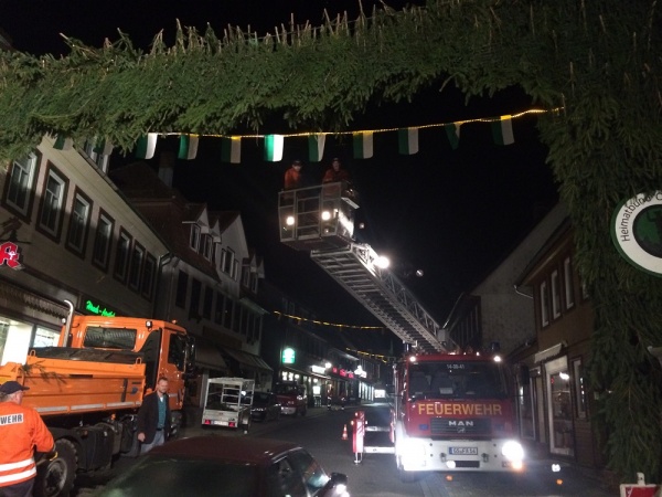 Treffen für den Wiederaufbau der Ehrenpforte ab 16.00 Uhr. Auch dieses Mal trafen sich viele Kameradinnen und Kameraden. Nun ging es mit neuem Seil und viel Enthusiasmus erneut zur Breiten Straße. Mit der Routine vom vergangen Freitag ging der erneute Aufbau in rund dreieinhalb recht zügig. Wir konnten die Maßnahme noch vor einbrechen der Dunkelheit positiv abschließen. Jedoch wurden wir die letzen 20 Minuten von einem unwetterartigen Regen erwischt, so dass die im Leiterkorb befindlichen Kameraden wortwörtlich bis auf die Unterwäsche nass wurden. Vielen Dank den Beiden, dass sie durchgehalten haben.