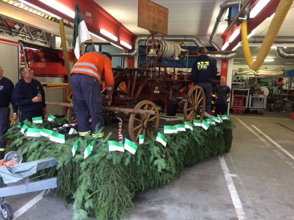 Um 10.00 Uhr ging es mit den Vorbereitungen für den Festumzug in den Endspurt. So galt es die Fahrzeuge zu schmücken und den Anhänger mit unserer alten Handdruckspritze (welche übrigens noch voll funktionsfähig ist) aufzubauen. Auf dem GW-L wurde eine "Modenschau" (Einsatzbekleidungen der letzen 50 Jahre) mit Hillfe von Schaufensterpuppen aufgebaut. Es wurden die Nebelmaschinen auf GW-L und DLK testweise aufgebaut.