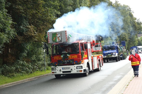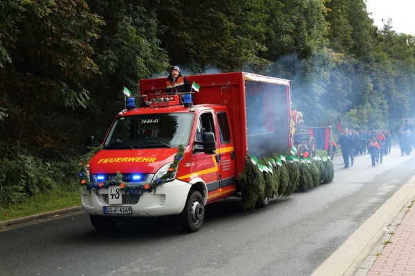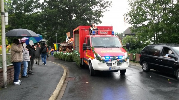 Treffen für alle um 13.00 Uhr. Es wurden die Restarbeiten an den Fahrzeugen getätigt und dann ging es auch schon los auf dem Glockenberg zur Aufstellung für den Festumzug. Wir marschierten die zwei Runden mit einer Fußgruppe und den zwei Fahrzeugen mit. Wobei ganz witzigerweise die erste Runde noch schön in Ausgehuniform stattfand und durch einsetzenen Regen dann die zweite Runde Überjacke statt fand. So war für die Zuschauer am Wegesrand Abwechlung geboten.