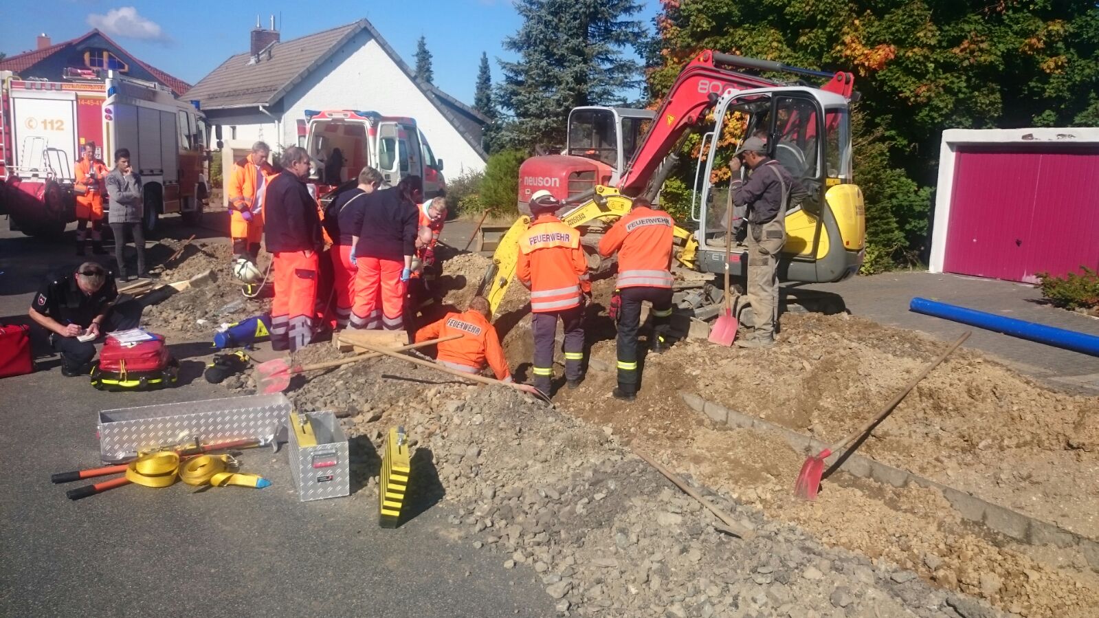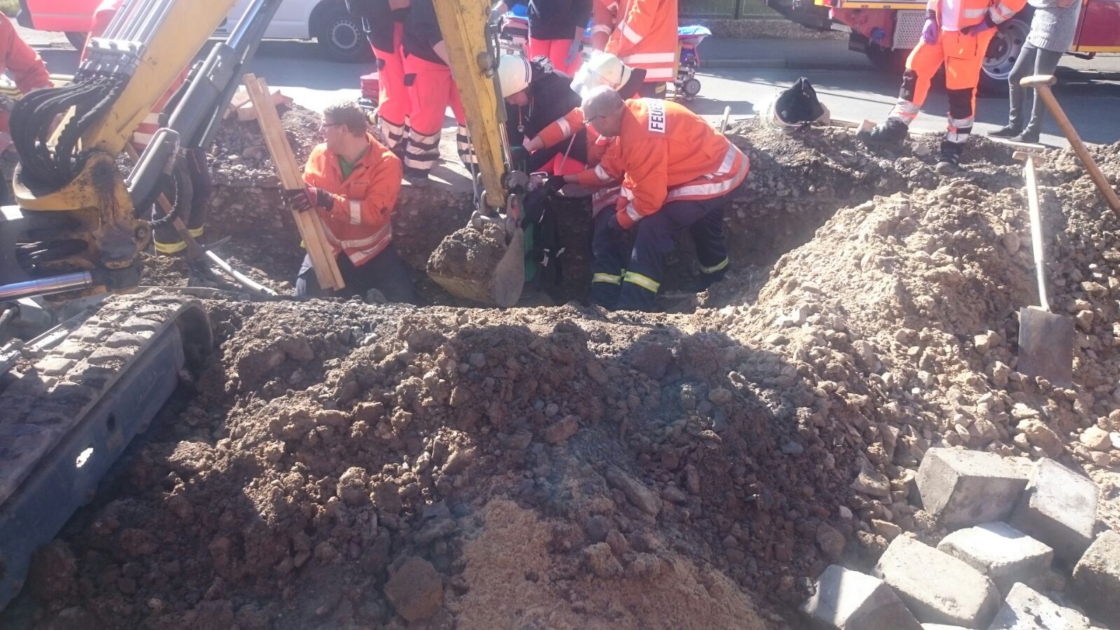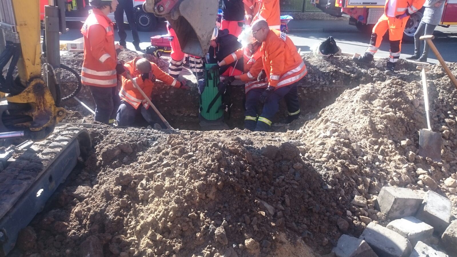Bauarbeiter von Erdreich und Asphalt bei Strassenbauarbeiten eingeklemmt