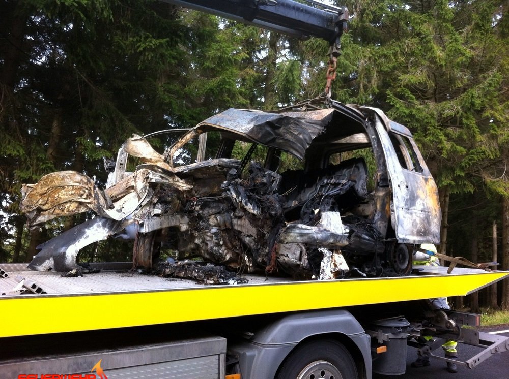Bei Eintreffen der ersten Kräfte stand das Fahrzeug in Vollbrand. Für den Fahrer kam hier bereits jede Hilfe zu spät.