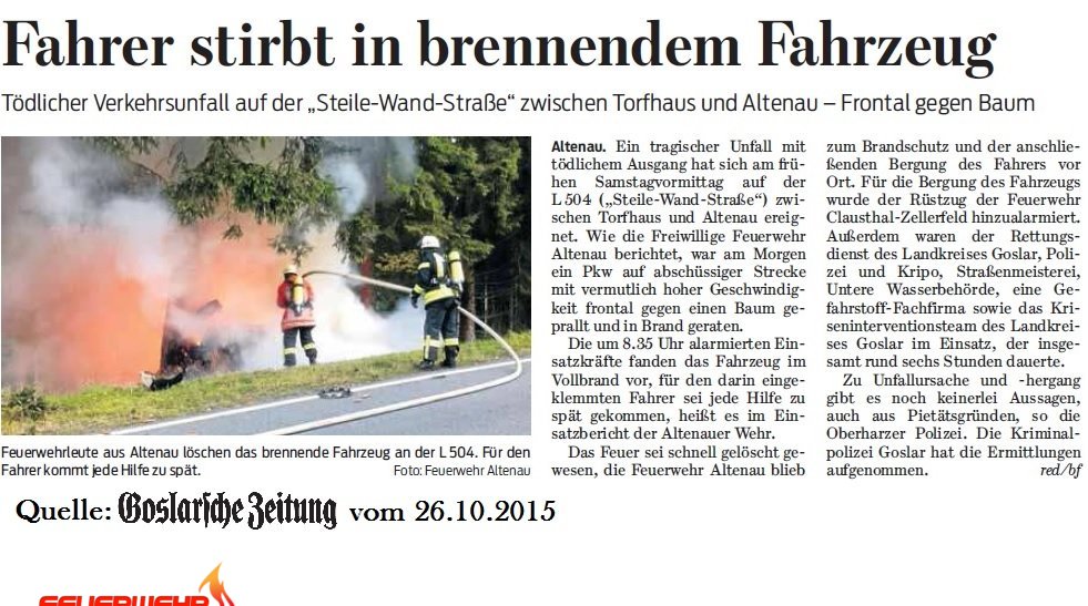 Zu einem tragischen Einsatz wurde die Feuerwehr Altenau auf die L504 (Steile-Wand-Straße) zwischen Altenau und Torfhaus alarmiert. Gemeldet wurde ein PKW-Brand.Ein Fahrzeug war mit vermeintlich hoher Geschwindigkeit auf abschüssiger Straße frontal gegen einen Baum gefahren und fing Feuer. Der Fahrer wurde durch den Aufprall eingeklemmt.