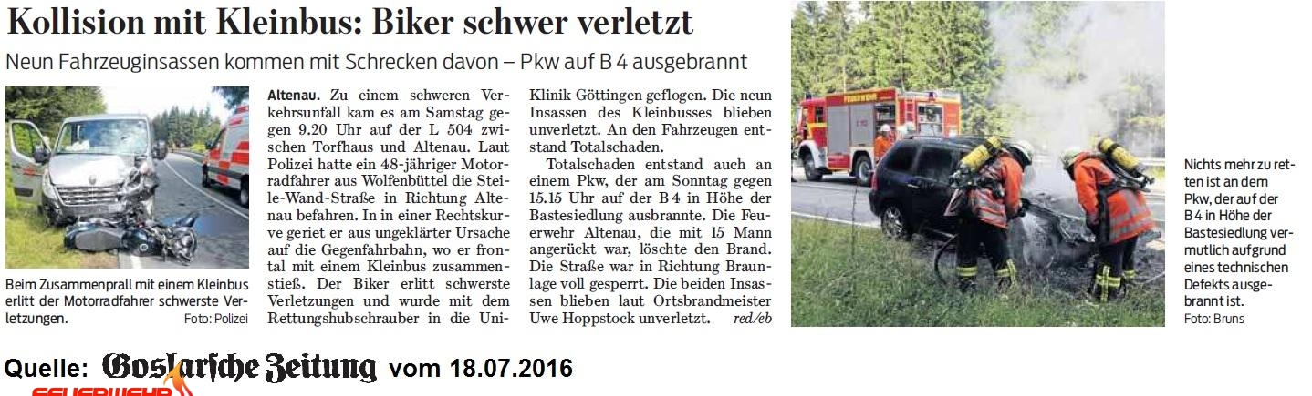 Die Feuerwehr Altenau wurde zu einem PKW-Brand auf die B4 alarmiert.Zwischen der Bastesiedlung und Torfhaus stand bei Eintreffen ein PKW aus ungeklärter Ursache in der vorderen Hälfte im Vollbrand.
