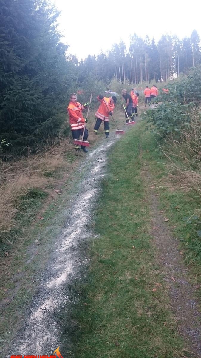 Ein ungewöhnlicher Einsatz. Mitten im Wald auf einem Waldweg entdeckte ein Förster eine ca. 150m lange vermeintliche Ölspur.Um ein Eindringen in das Erdreich zu verhindern, ließ er die Feuerwehr alarmieren.