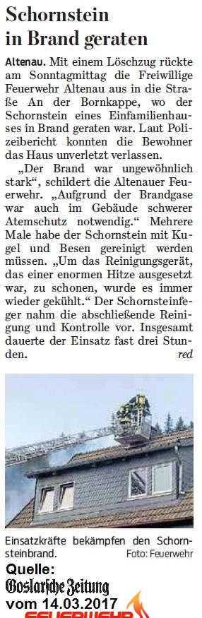 In einem Gebäude in der Straße "An der Bornkappe" kam es zu einem Schornsteinbrand.Dieser war ungewöhnlich stark, somit war aufgrund der Brandgase auch im Gebäude schwerer Atemschutz notwendig. Die Enge im Gebäude erschwerte den Einsatz insbesondere.