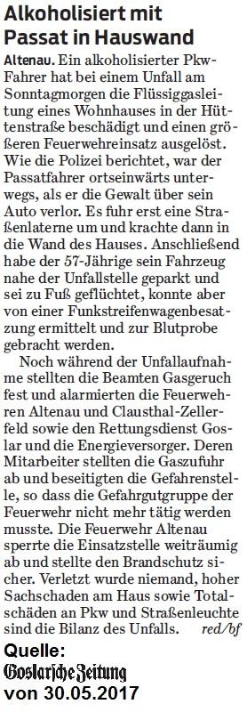 Der PKW hatte bei dem Unfalll eine Flüssiggasleitung beschädigt. Die zuerst eintreffende Feuerwehr Altenau sperrte umgehend den gefährdeten Bereich weiträumig ab und schieberte den Flüssiggastank ab.