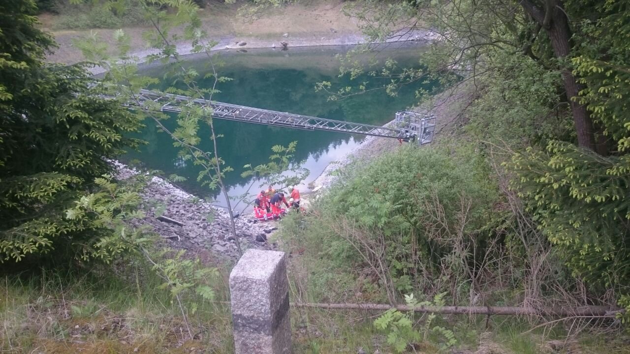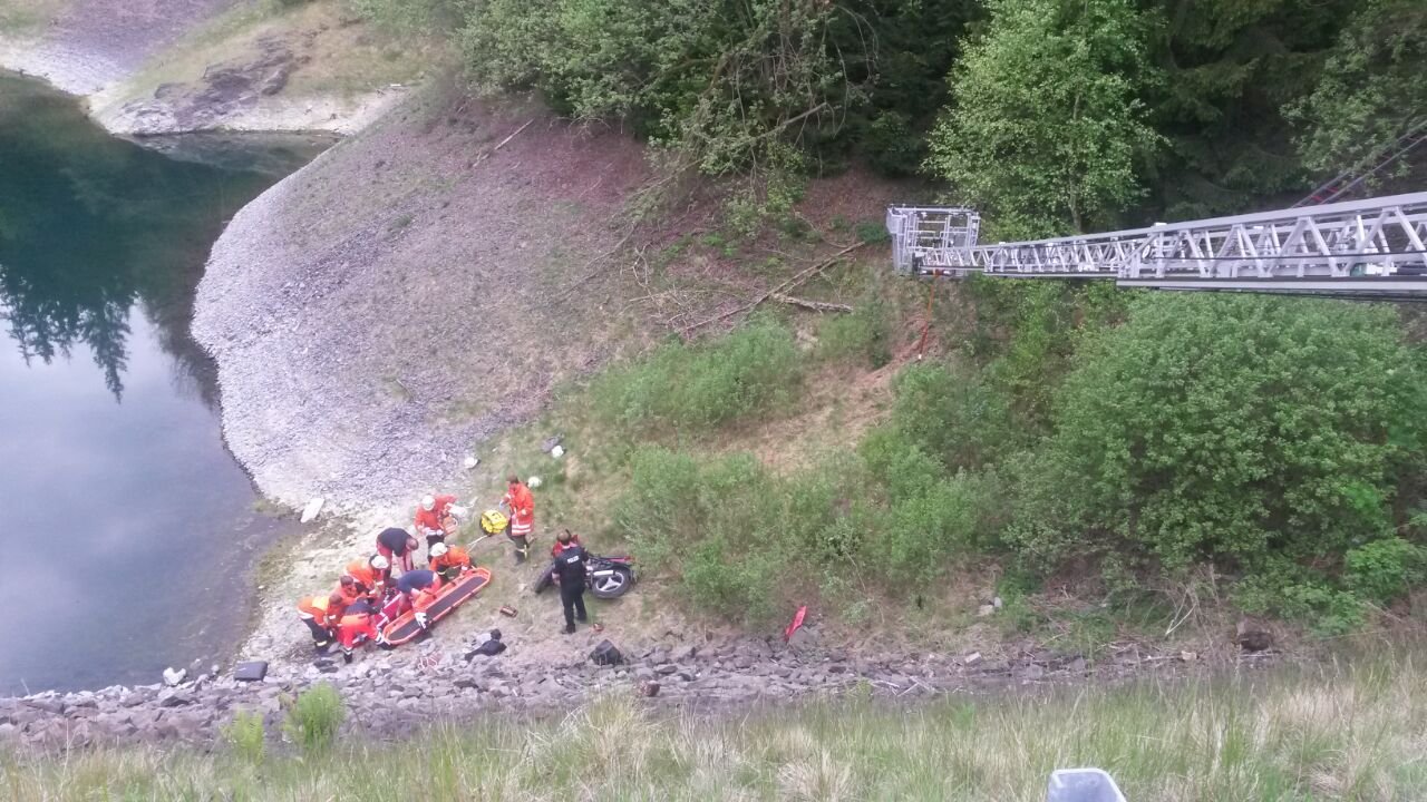 Bei einem Verkehrsunfall am 22.05.2015 ist ein Motorradfahrer schwer verletzt worden.Aus bisher unbekannter Ursache kam dieser aus Fahrtrichtung Goslar kommend kurz hinter der Weißwasserbrücke in einer Linkskurve rechts von der Fahrbahn ab und stürzte einen ca. 25m hohen, steilen Schotterhang herab und blieb kurz vor dem Wasser liegen.