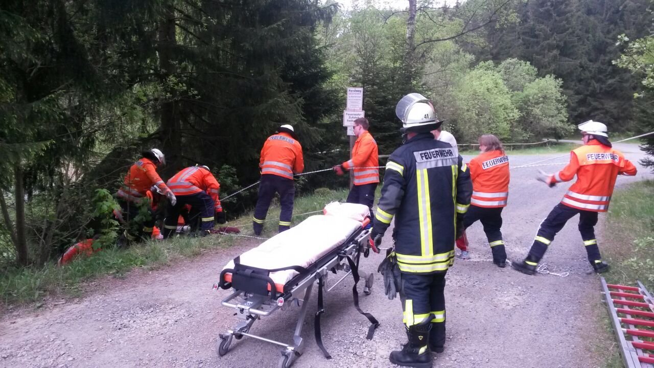 Die Feuerwehr Altenau unterstütze sowohl hierbei, als auch im Folgenden bei dem aufwendigen Transport des Patienten von der Unfallstelle zum RTH.