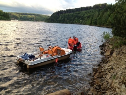 Gekenteres Segelboot. Die zufällig anwesende DLRG schleppte das Boot in Ufernähe wo der Segler es wieder eigenständig aufrichten konnte. Ein an Bord befindliches Kind wurde ebenfalls vom DLRG an Land gebracht und dem Rettungsdienst übergeben. |